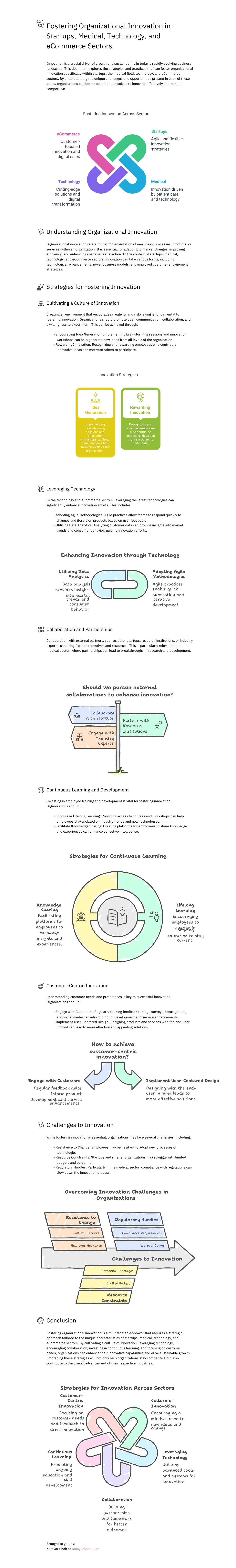 Organizational innovation drives competitive advantage across startups, medical, technology, and eCommerce sectors. Success requires establishing dedicated innovation teams, investing in employee development, fostering psychological safety for risk-taking, and implementing rapid testing cycles. Sector-specific strategies address unique regulatory and market challenges. The following strategies prove effective for each industry.