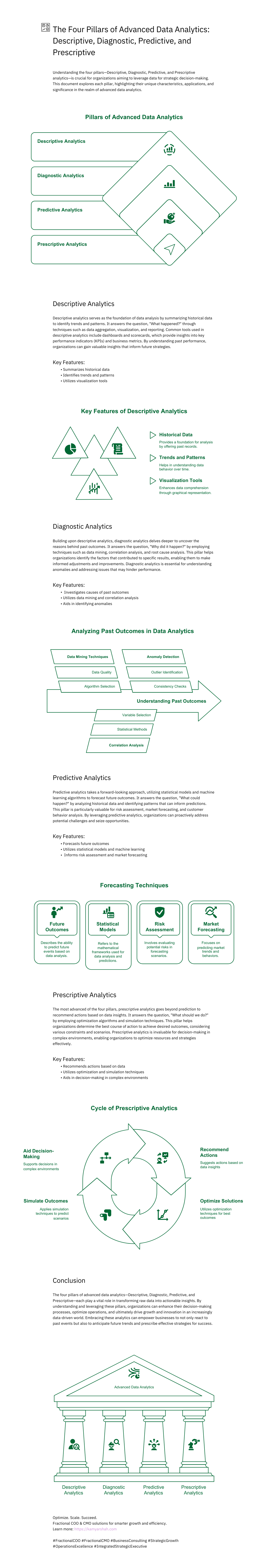 The four pillars of advanced data analytics represent the evolutionary stages of data analysis capability. Descriptive analytics answers what happened, diagnostic analytics explains why it happened, predictive analytics forecasts what will happen, and prescriptive analytics recommends what actions to take. Understanding each pillar transforms raw data into actionable business intelligence. The following sections explore how these pillars work together.